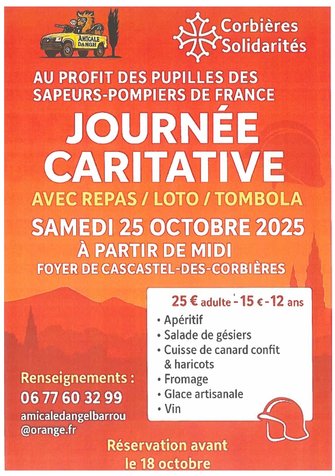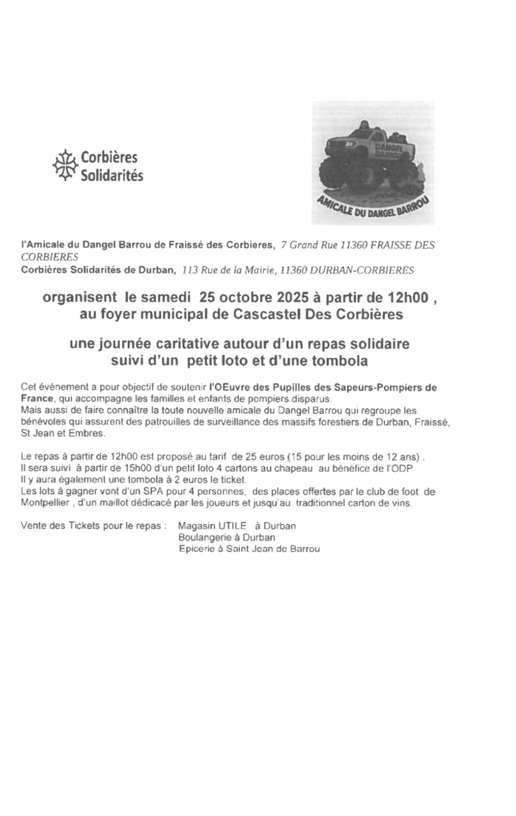 Samedi 25 Octobre, Journée Caritative Corbières Solidarité, Amicale du Dangel Barrou, au Foyer de Cascastel