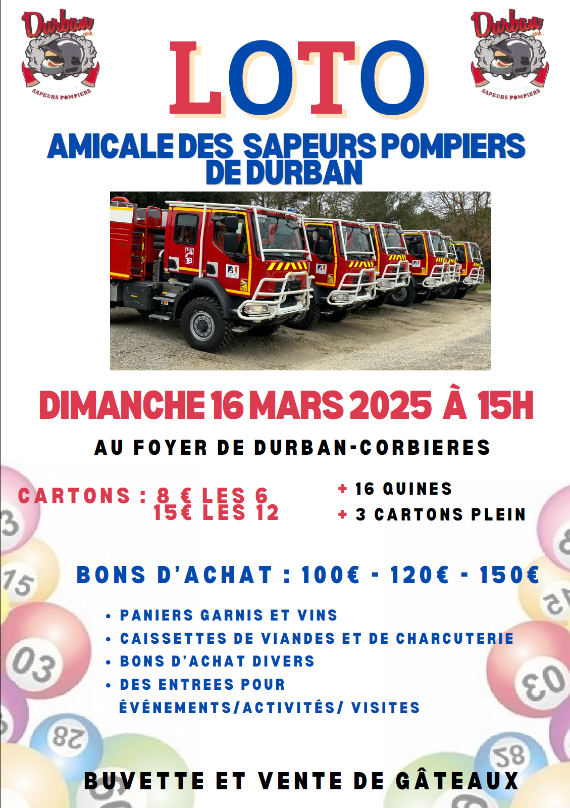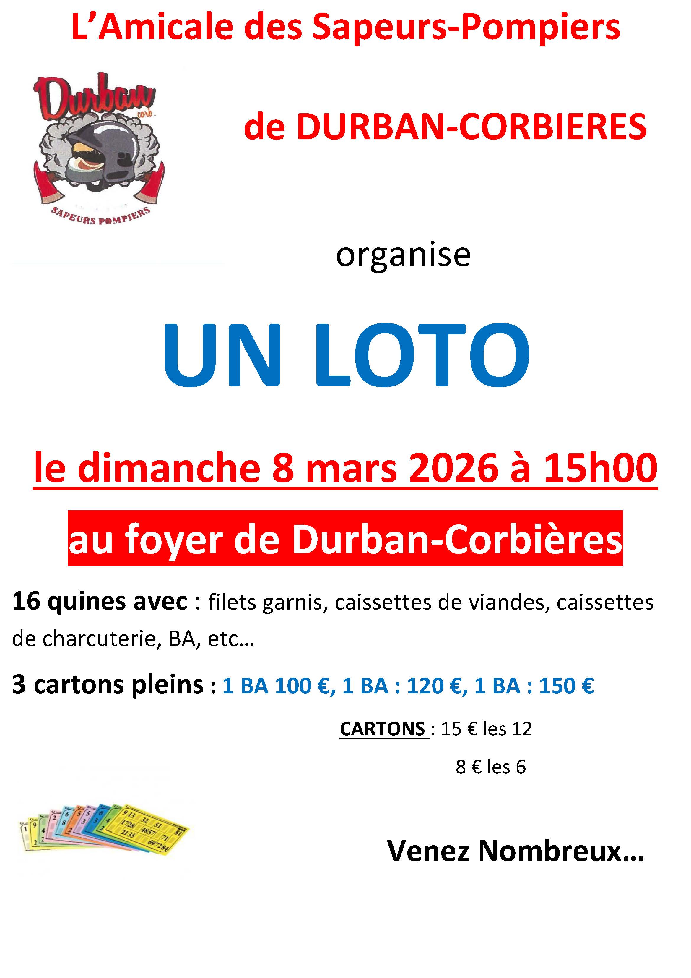 Loto Amicale Sapeurs Pompiers de Durban, Dimanche 16 Mars 2025 à 15h