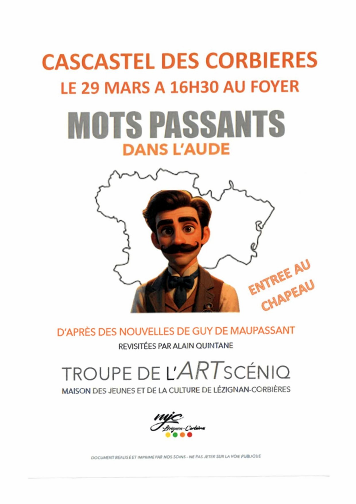Théâtre MOTS PASSANTS à Cascastel, le Dimanche 29 Mars à 16h30, au chapeau