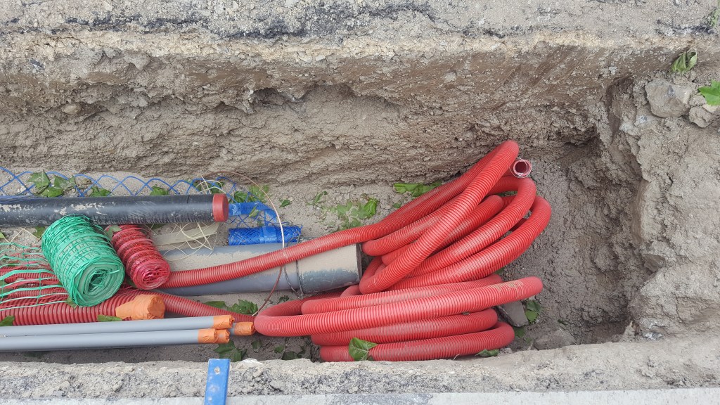 Ces travaux imposaient aussi d’ouvrir la chaussée de l’Allée des Jardins jusqu’au raccordement électrique. A la demande de la municipalité, il a été pratiqué une tranchée plus profonde afin de réaliser, en régie communale, la reconstruction du tout à l’égout et la mise à niveau de l’alimentation en eau potable.