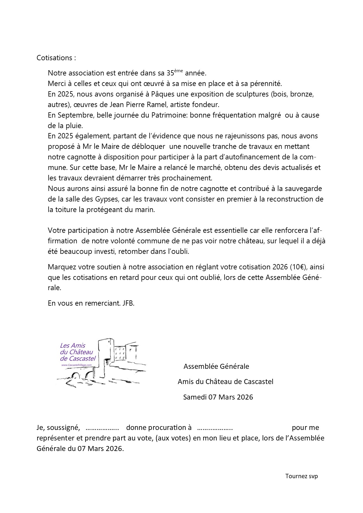 Nos Assemblées Générales se veulent ouvertes à toute personne intéressée. Contact: amischateau.cascastel@orange.fr