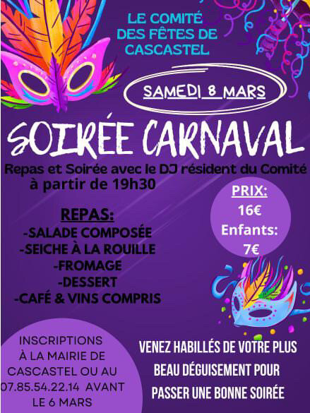 Le Comité des Fêtes de Cascastel vous propose Samedi 18 Février à parti de 20h au Foyer Municipal une soirée Carnaval.