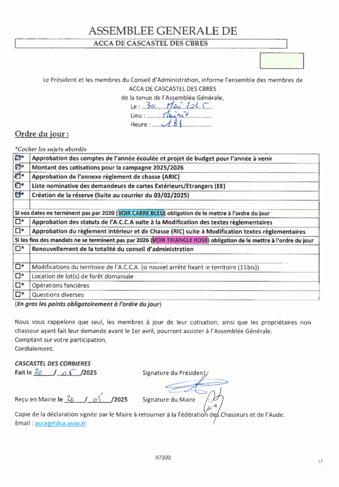 Assemblée Générale ACCA Cascastel, le Vendredi 30 Mai à 18h, Mairie de Cascastel
