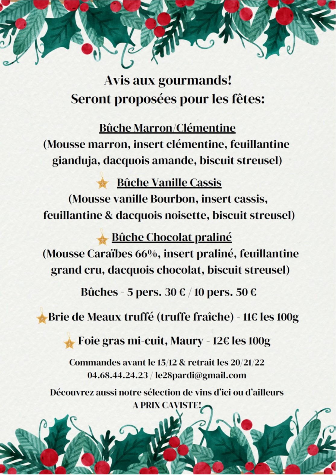 Pensez également à nous passer commande si vous souhaitez des huîtres de Marennes Oléron, foie gras, bûches, et autres gourmandises de fêtes.